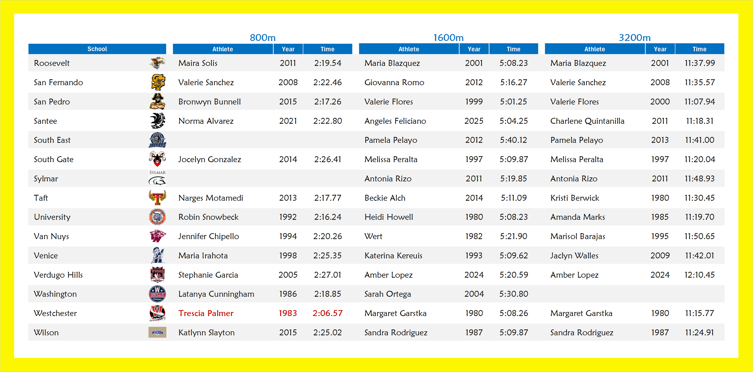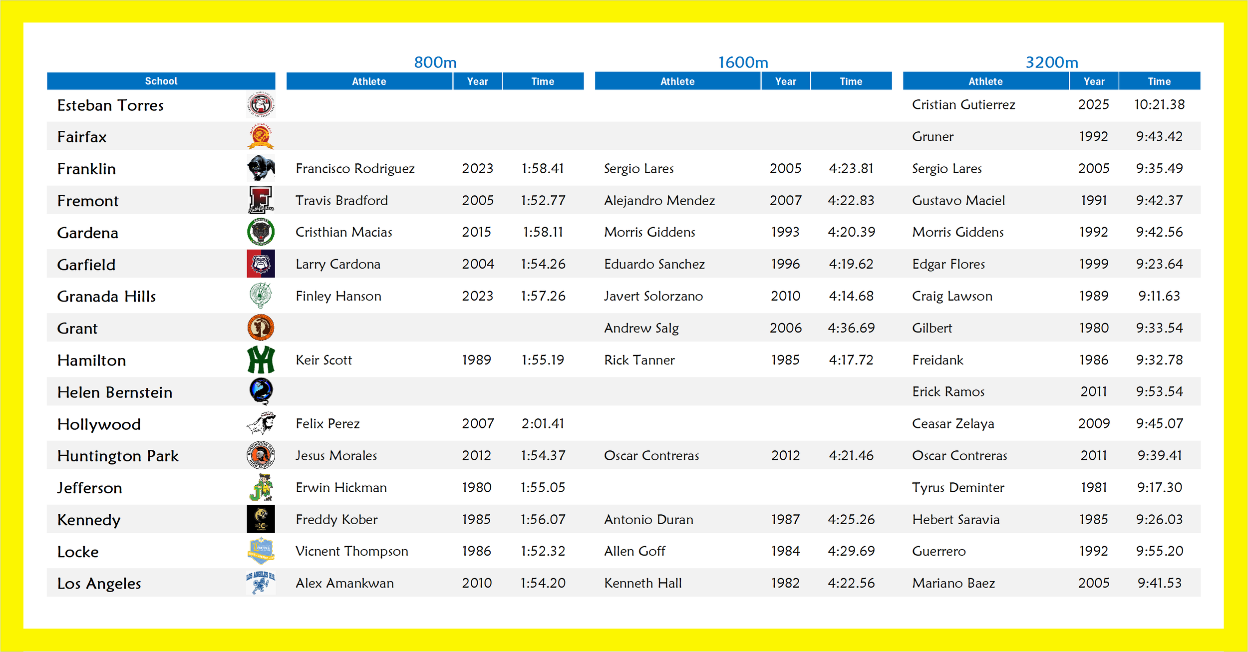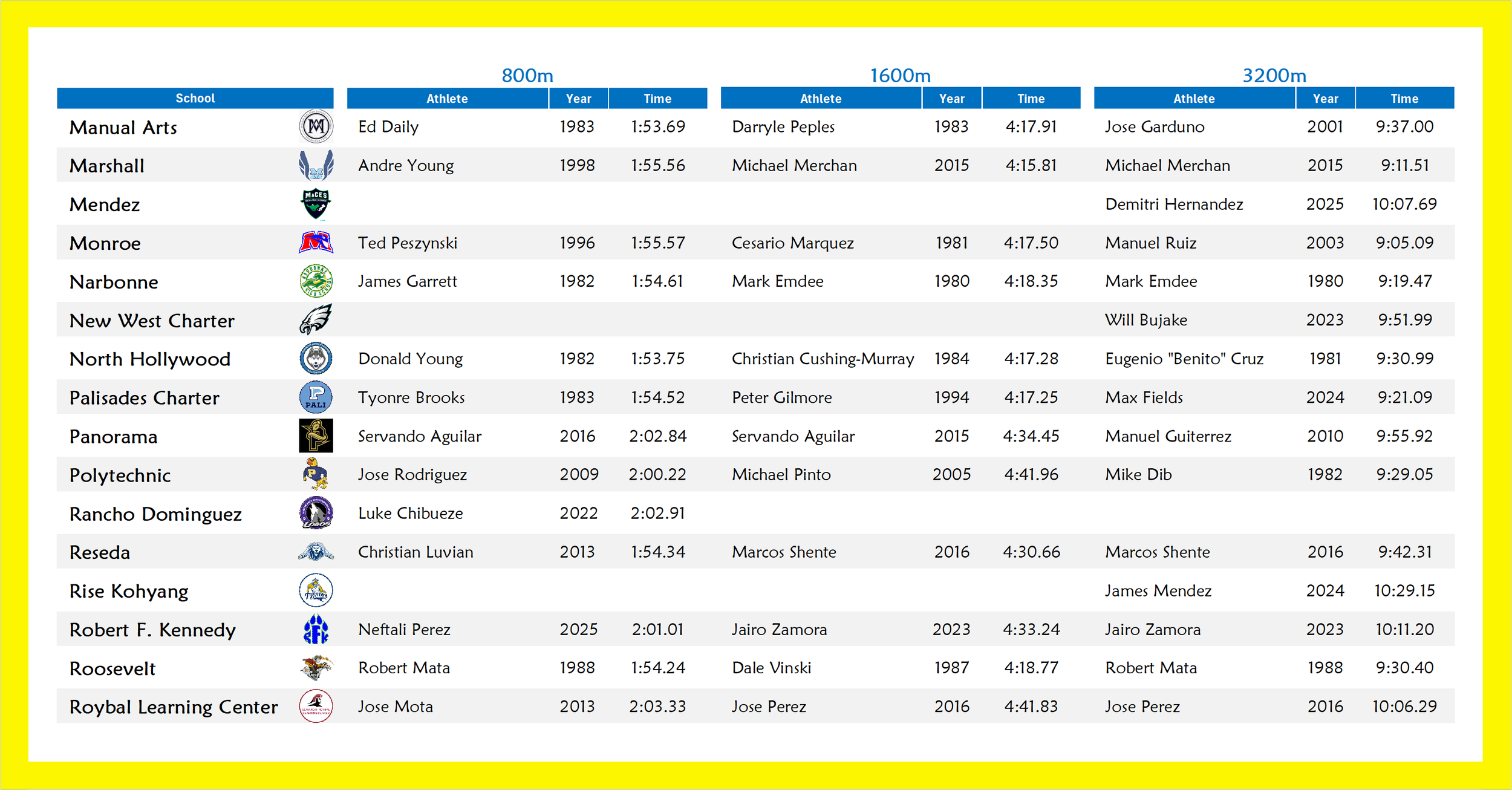 I’ve had several requests to provide LA City Section records for track. The table below lists each City school’s top performance in the 800m, 1600m, and 3200m at the LA City Section Finals (the official City records per the CIF LA City section) from 1980-2025. The times were compiled from athletic.net (2000-2025) and newspapers such as the LA Times and The News-Pilot (1980-1999). Note that performances outside of City Finals and before 1980 are not included. Notably missing are Ian Alsen’s (Granada Hills) incredible double of 4:09.67 and 8:59.54 at the 1988 Arcadia meet, Jose Amaya’s (Wilson) record-setting 8:54.4 in the 2-mile (8:51.3 3200m equivalent) at the 1971 State Finals, and Marrisa Williams 4:39.88 at the 2015 State Finals. Click here to see the data used to compile this list.
