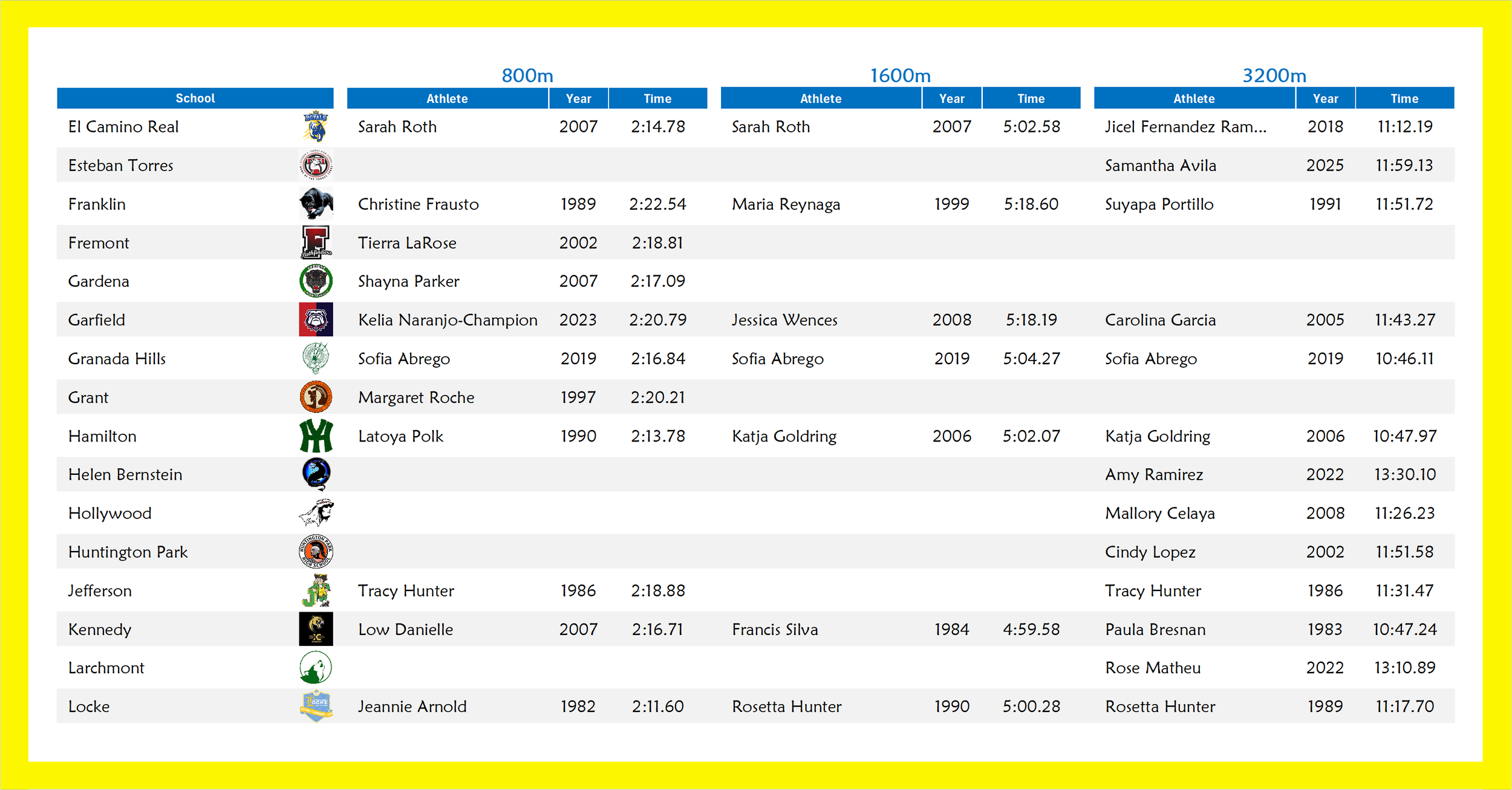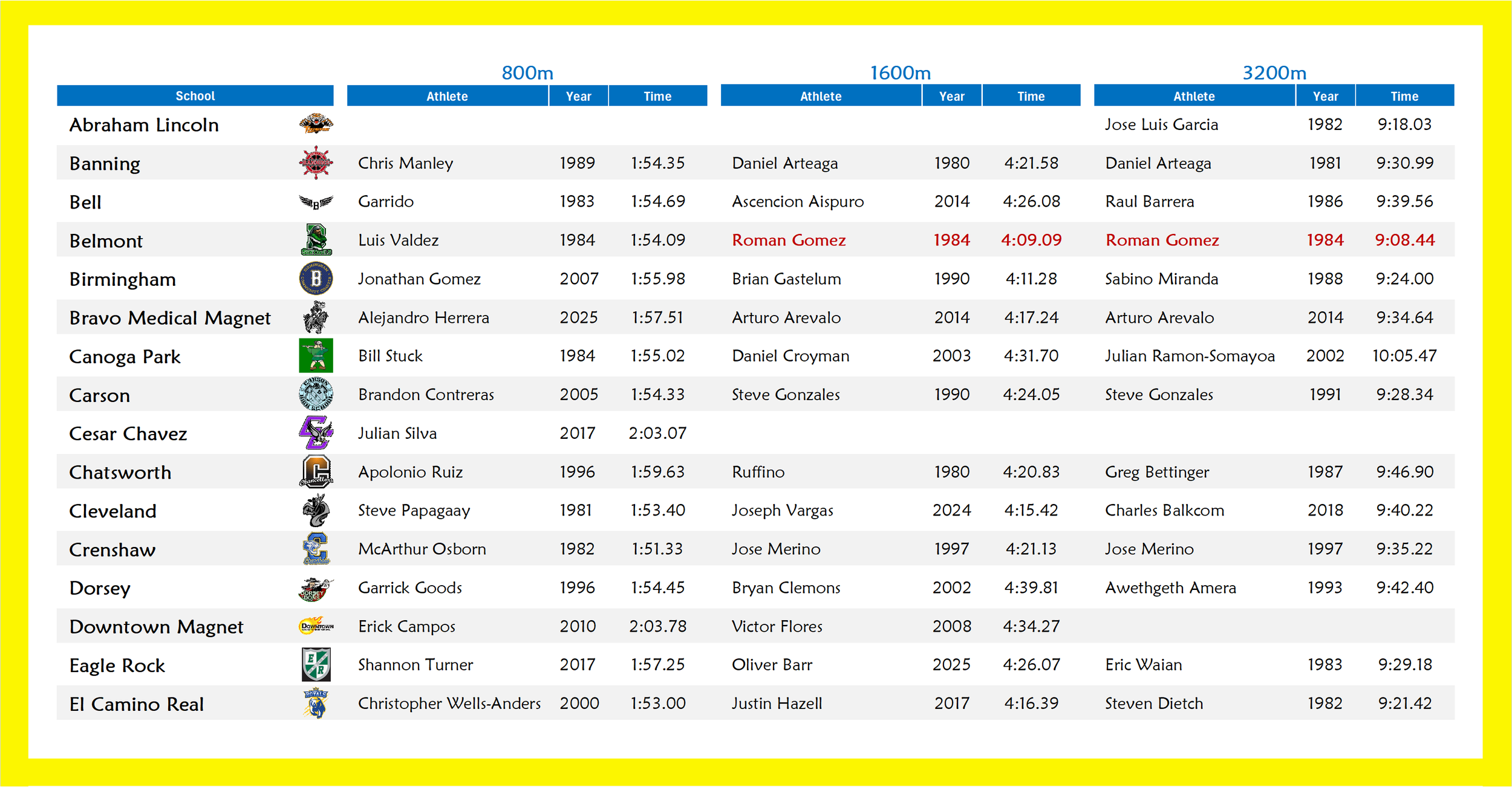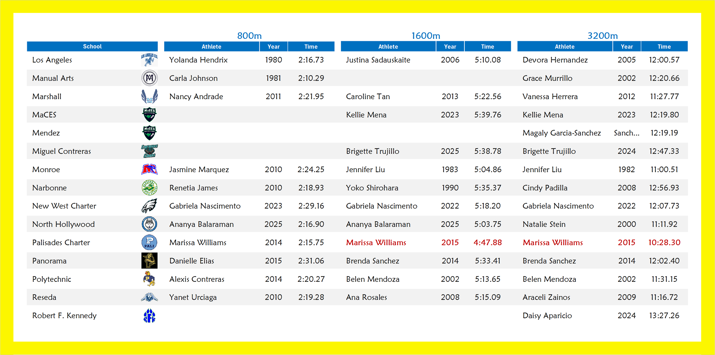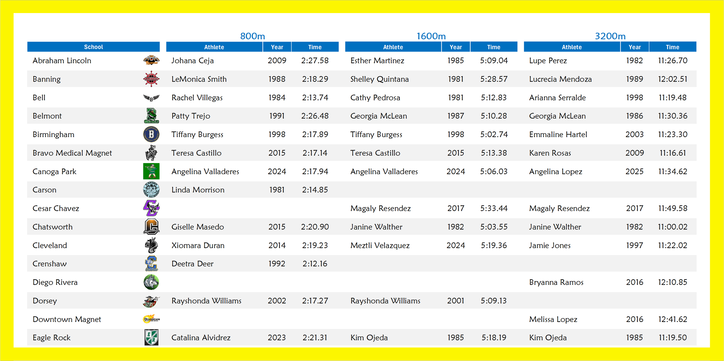 I’ve had several requests to provide LA City Section records for track. The table below lists each City school’s top performance in the 800m, 1600m, and 3200m at the LA City Section Finals (the official City records per the CIF LA City section) from 1980-2025. The times were compiled from athletic.net (2000-2025) and newspapers such as the LA Times and The News-Pilot (1980-1999). Note that performances outside of City Finals and before 1980 are not included. Notably missing are Ian Alsen’s (Granada Hills) incredible double of 4:09.67 and 8:59.54 at the 1988 Arcadia meet, Jose Amaya’s (Wilson) record-setting 8:54.4 in the 2-mile (8:51.3 3200m equivalent) at the 1971 State Finals, and Marrisa Williams 4:39.88 at the 2015 State Finals. Click here to see the data used to compile this list.