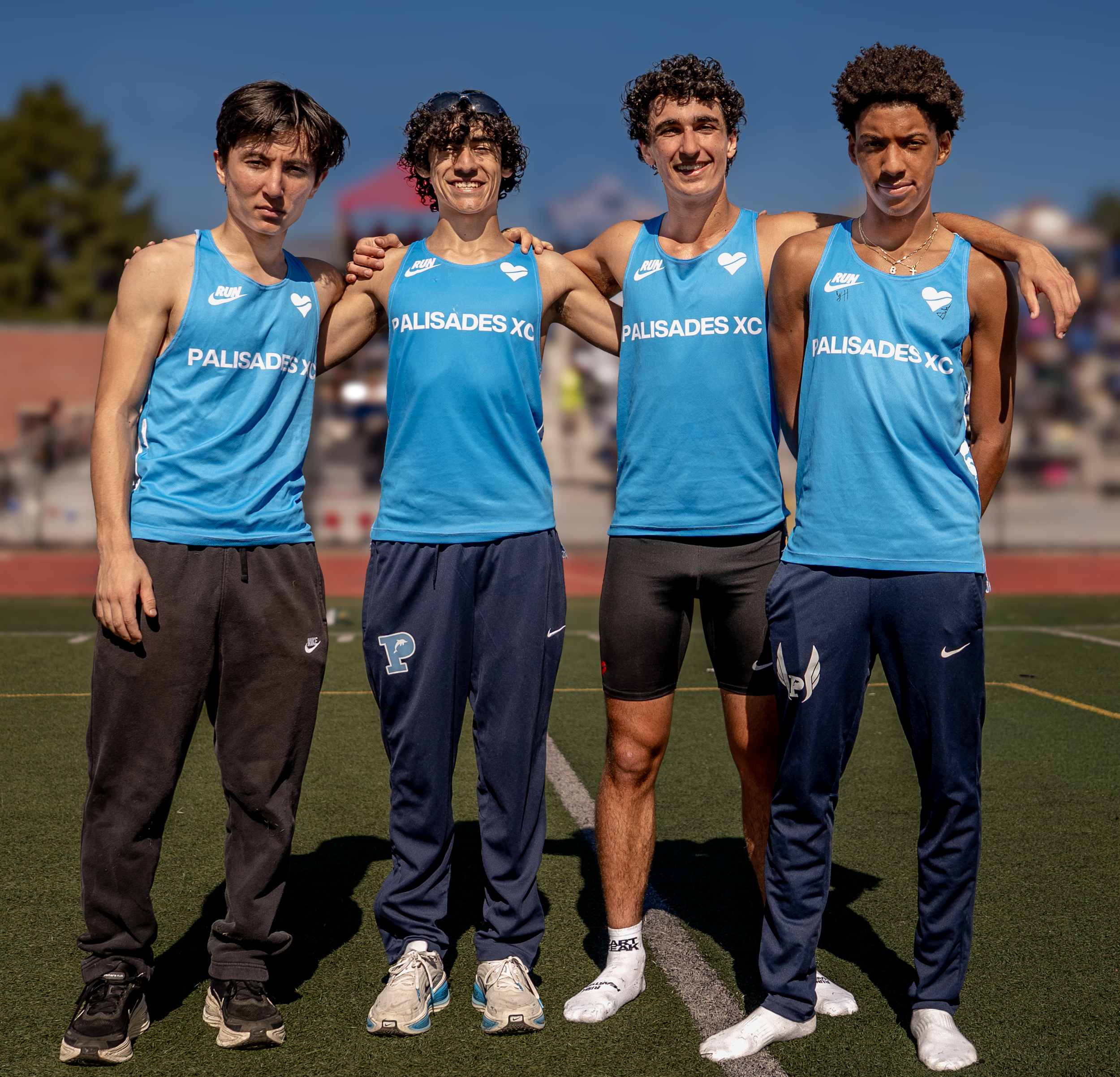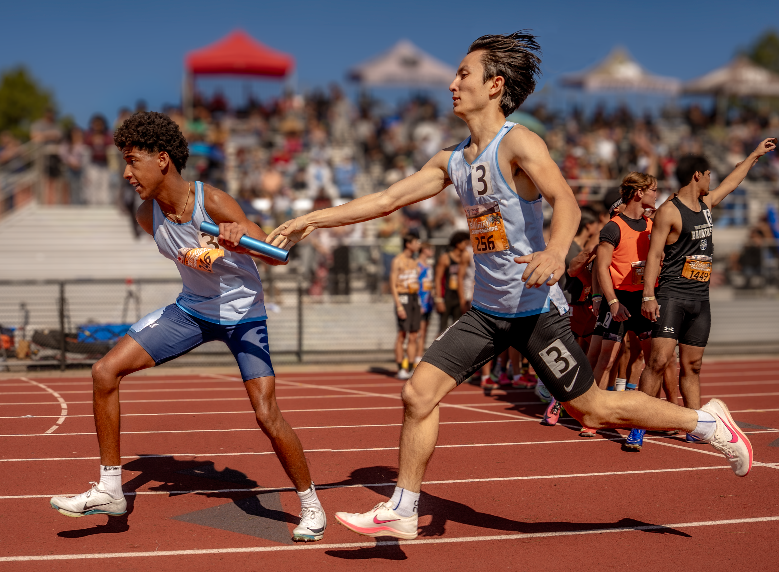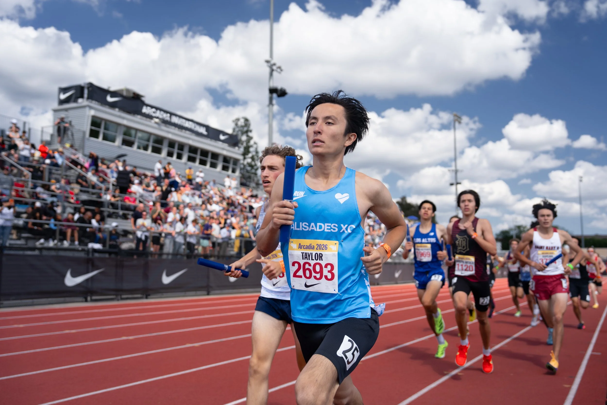 JACKSON TAYLOR finishes the 1,200m 1st leg of the distance medley relay handing off to BRENDEN HARPER for the 400m leg. Palisades placed 5th in the race and set school a school record of 10:36.78.