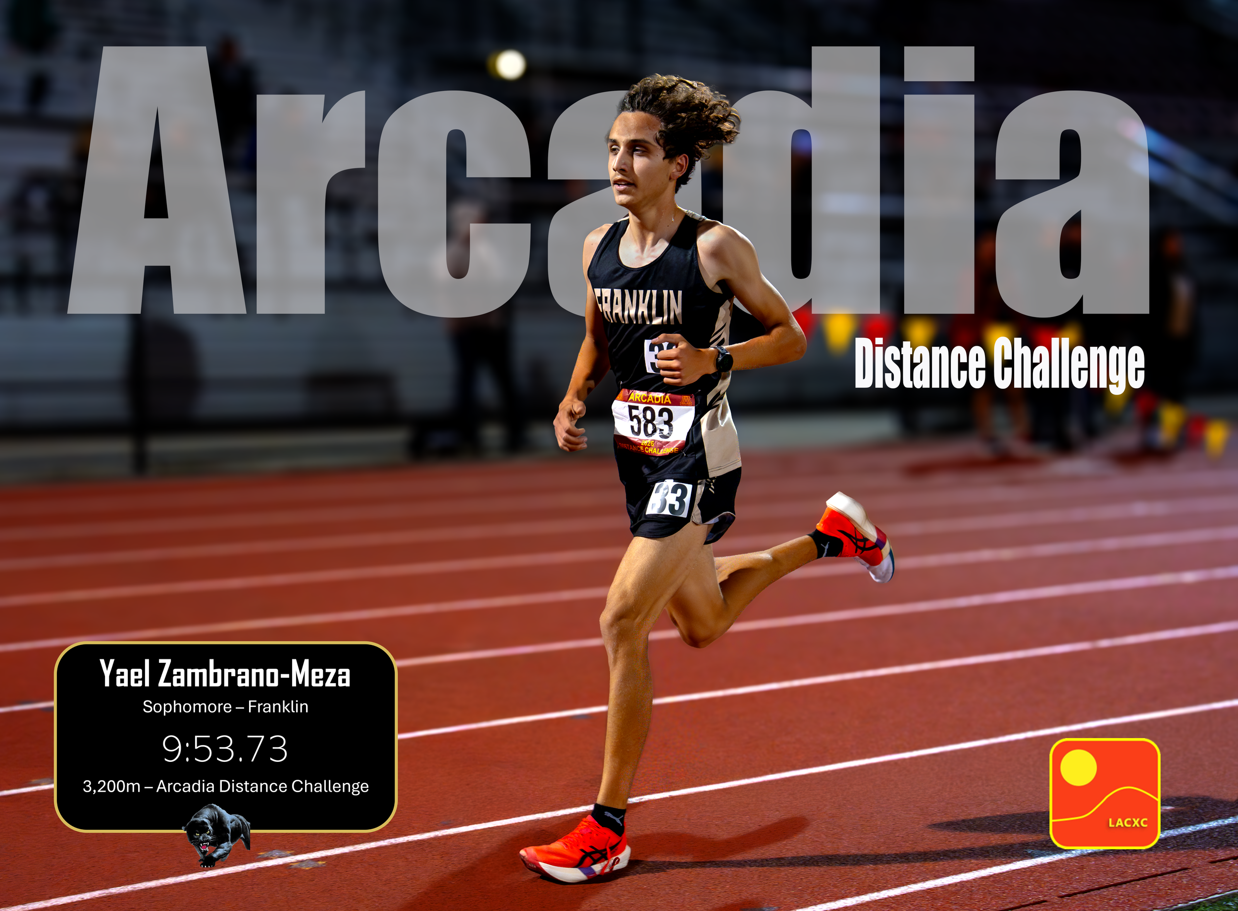 Franklin sophomore Yael Zambrano-Meza placed 2nd in his 3,200m race and won his heat of the 800m earlier in the day, two of the top City performances at the Arcadia Distance Challenge. Yael’s 3,200m time of 9:53.73 set a grade-level Franklin school record.