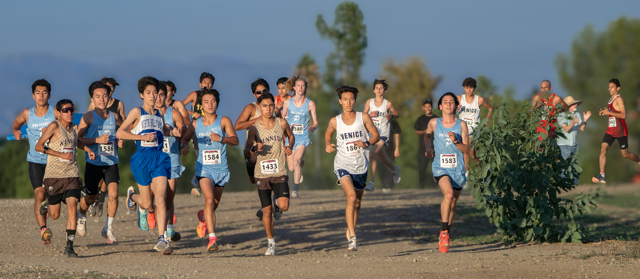 On Wednesday, ANANYA BALARAMAN ran in her first race since Woodbridge and didn’t miss a step. Competing in the same race as Palisades, Kennedy and Venice, Ananya took the lead early and held on for a perfunctory win in the combined race (East Valley, Valley Mission and Western leagues) and a course record of 17:55.4. Her teammate, sophomore KENSUKE OHSHIMA, also won the boys East Valley varsity title and placed 6th overall in a time of 15:48.4. On most days that would rank as the top sophomore time but Kennedy’s FELIPE PEREZ took that honor by 3 seconds with the 4th best time of the day 15:45.3. And in most years, Felipe’s performance would have ranked as Kennedy’s best but in one of the gutsiest performances of the race his teammate senior JOSIAH CASTRO went out with the City’s top runners and led the combined race going into the final mile, ultimately winning the Valley Mission title and posting the 3rd best time on the day. In the girls’ race, EMILY RODRIGUEZ performed similar magic for her Kennedy team also winning the Valley Mission title and posting the 3rd best time on the new Pierce course this year. GEORGIA ILLINGWORTH placed 2nd in the Valley Mission contest and 7th overall; a wonderful race for sure but the performance of the day was her incredible sportsmanship in attempting to assist an ailing competitor 20 meters from the finish. Really magical stuff from Kennedy! Both Palisades varsity teams won the combined and Western league contests handedly. In previous years Palisades has swept these races in trainers. This year Kennedy, Venice, North Hollywood and Sylmar provide some worthy competition. DAILA HARINCK led the Palisades girls with the 2nd best time this year on the new course to win the Western league individual title. In the category of ‘Most Improved’ runner, teammate MAYA BHASIN placed 2nd in league with the 5th best time overall, 18:55.2. And, maybe the biggest surprise, another sophomore, Sylmar’s ELIANNA RAMIREZ posted a 54-second PR of 18:54.1 to place 2nd in the Valley Mission league and the 7th best time on the Pierce course this year. Palisades senior ZACH COHEN led out the boys combined race but it was teammate senior JACKSON TAYLOR who stole the show in the final mile surging from 5 seconds behind the lead pack to win by 10 seconds in a new course record (for a day) of 15:29.6. Another “Most Improved” award to senior LAJUS COLLINS who finished as Palisades #3. The Venice boys’ varsity kept Palisades honest with big performances by seniors RYAN PERRELLA and ALEJANDRO ESCOBAR, who both broke 16 minutes.