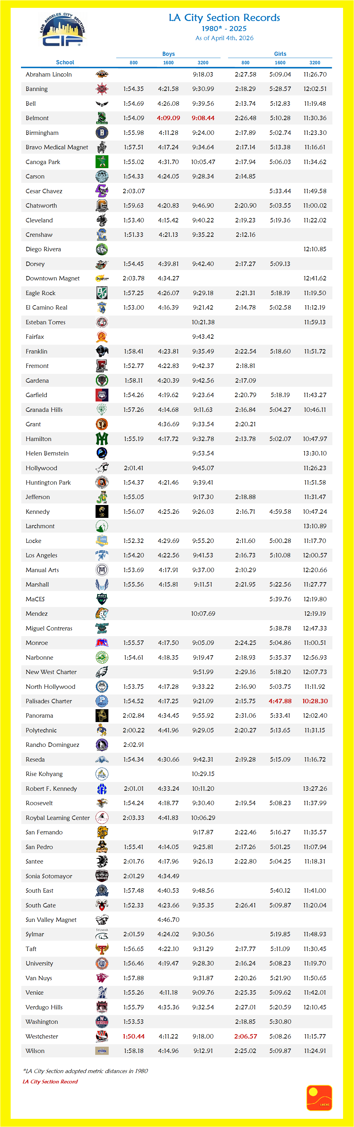 Jackson Taylor is part of Palisades’ elite distance program that is redefining standards for City athletes. His PB of 4:17.94 in the 1600m at The TEN ranks #4 all-time at Palisades and #2 on the '26 LA City leaderboard behind teammate Ernesto Jalomo.