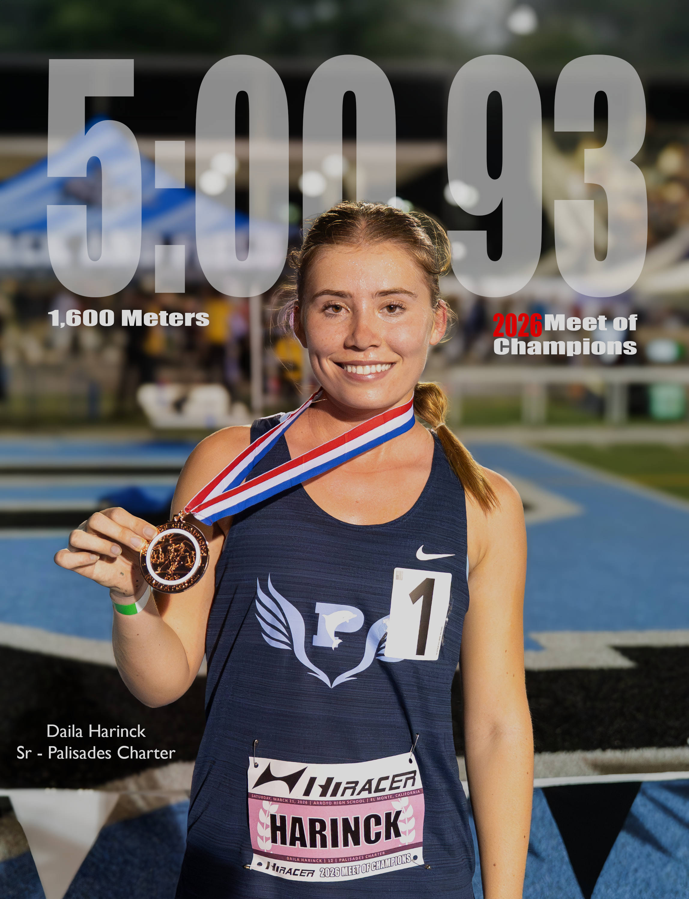 Palisades Charter athletes impressed at the Meet of Champions. Daila Harinck almost broke 5-minutes in the Invitational 1600m, something only 3 City runners have done in the last 10 years. She’s now #2 all-time on the Palisades record sheet behind City legend Marissa Williams.