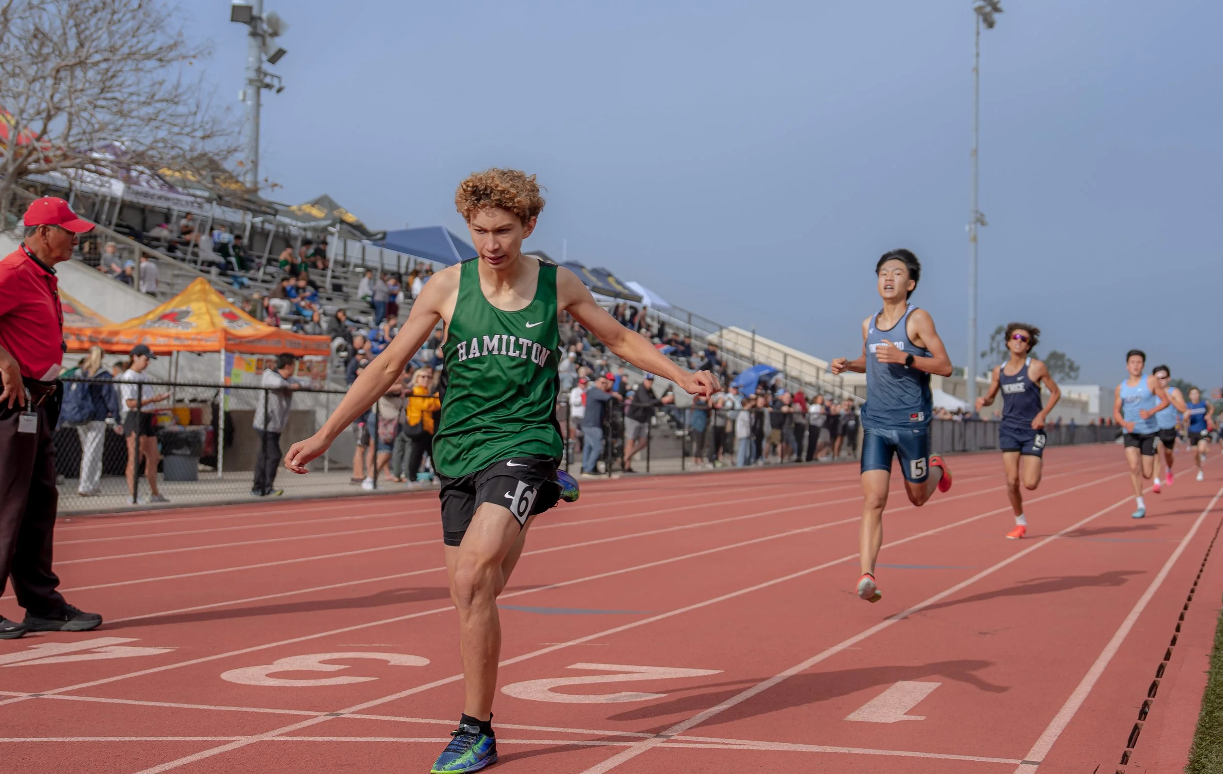 Hamilton freshman ALEC SHARPLEY looks to be the real deal. Alec won the 1,600m frosh/soph race in 4:44.11 at Beach Cities with a big finish down the final straight-away. He then completed the double with a 4th place 2:10.52 in the 800m. Both times are PB’s for Alec.