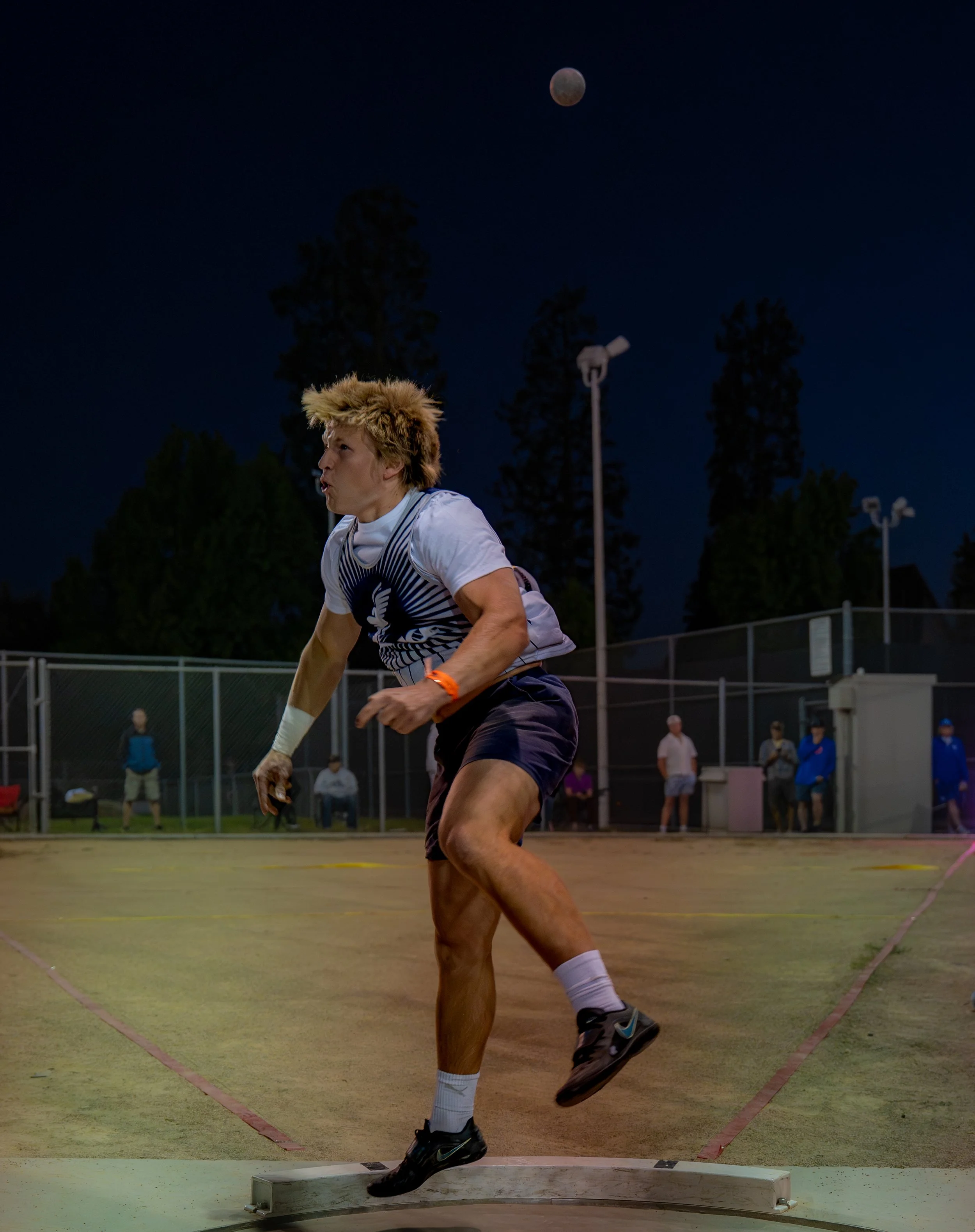 Venice senior Lawrence Kensinger launches a 59’-2” throw at Arcadia to take 5th place in the invitational shotput.
