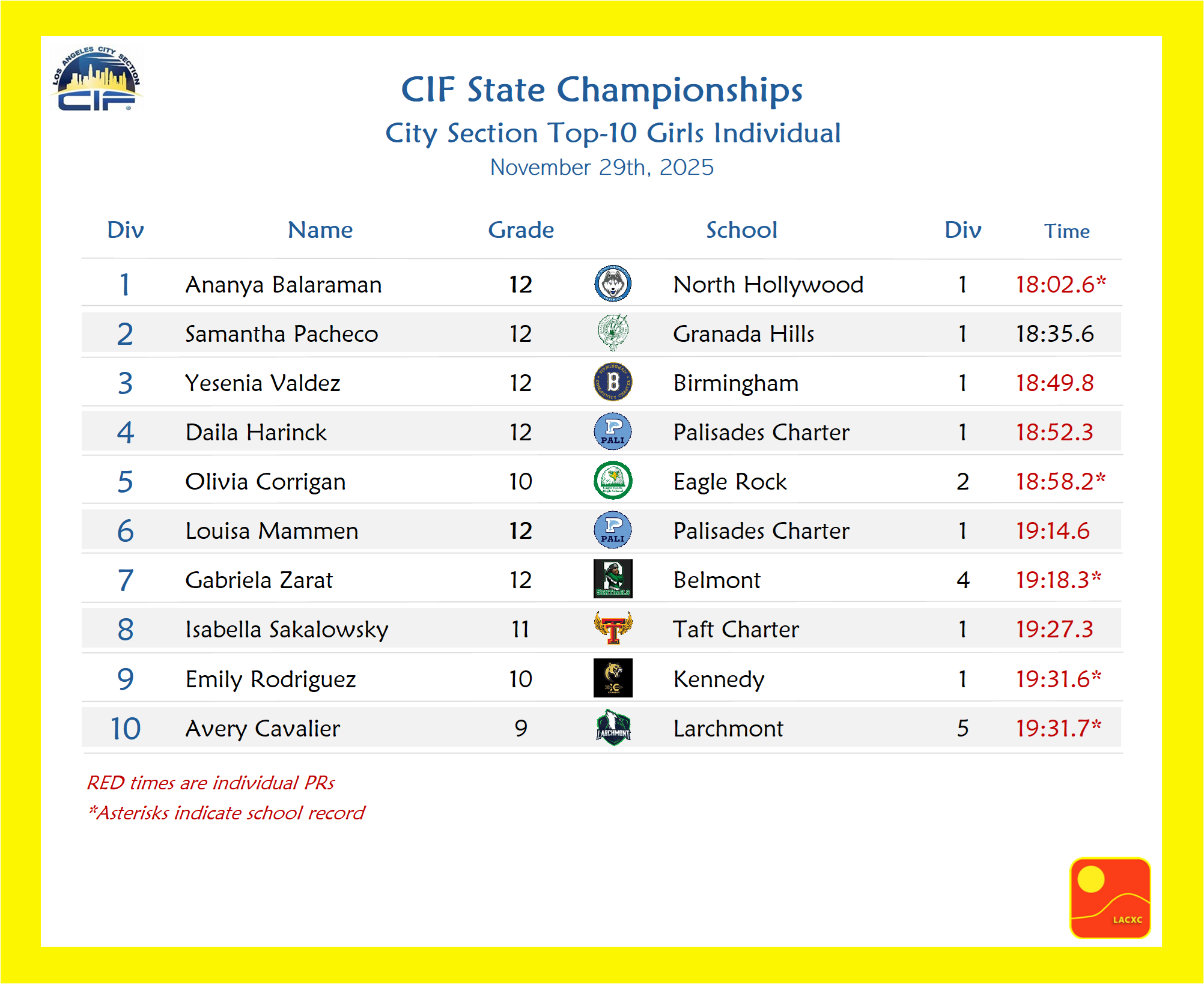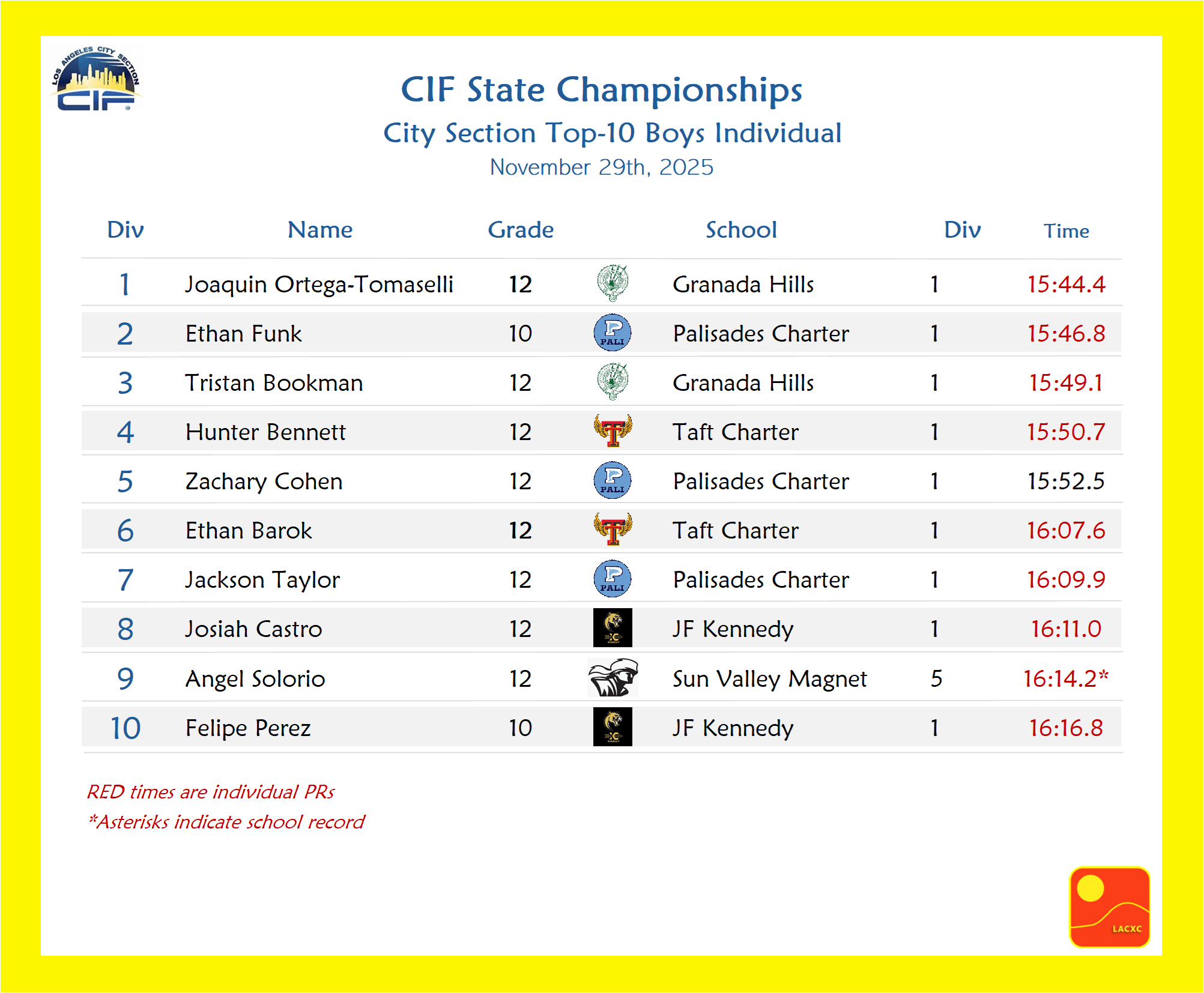 Lots of great performances at the Winter Championships and Will Abiragi’s 1:23.20 in the 600m may have been the best. The performance ranks #2 all-time in the LA City section for 600m and the best sophomore time. The time converts to a 1:54.82 for the 800m which would be a City grade-level record and the 14th best time for any grade in the last 20 years.