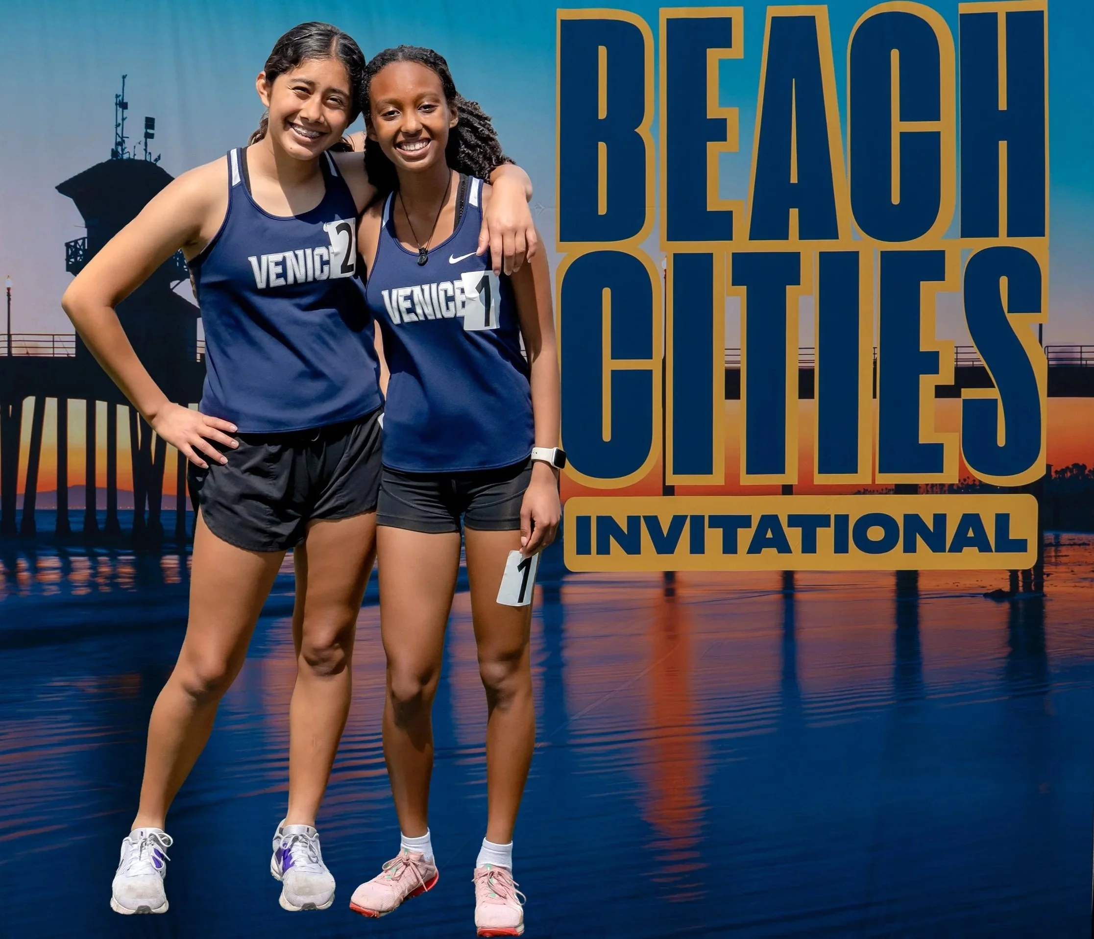 Venice sophomores Breanna Morales and Harina Girmay celebrate after the Frosh/Soph 800m