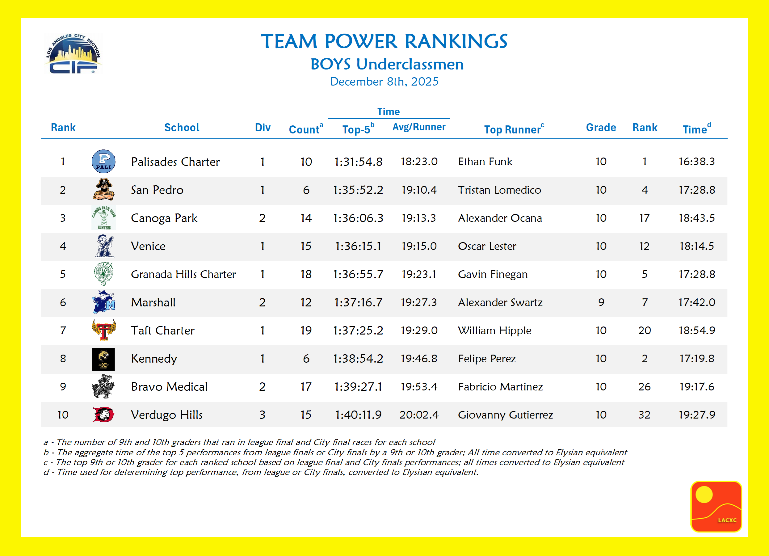 The Process: Individual league final times were converted to ‘standard-based’ times in order to rank and score runners’ results from the 3 different league final venues: Elysian Park, Pierce College and 22nd St Park. These standard times were used to determine divisional scoring based on simulated competitions from the top 7 runners from the top 12 schools in each division. These simulated scores provided the initial rankings which were then amended based on analysis and interviews to produce the LACXC.com Power Rankings presented above.