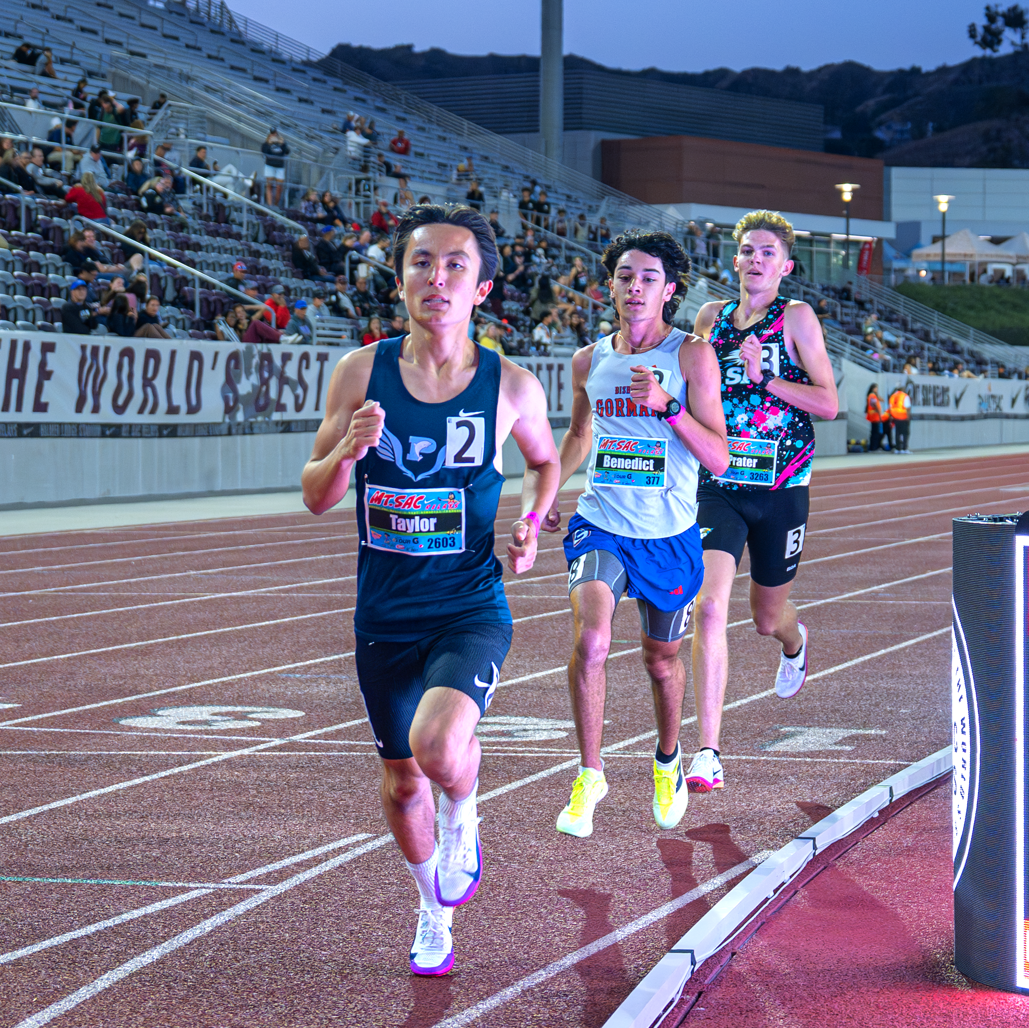 This is the final 50 meters of the varsity Invitational-3 1,600m at Meet of Champions! That’s Palisades senior JACKSON TAYLOR leading the chase pack in lane 2. His time of 4:20.46 is #1 on the City leaderboard and is the #4 Palisades performance.
